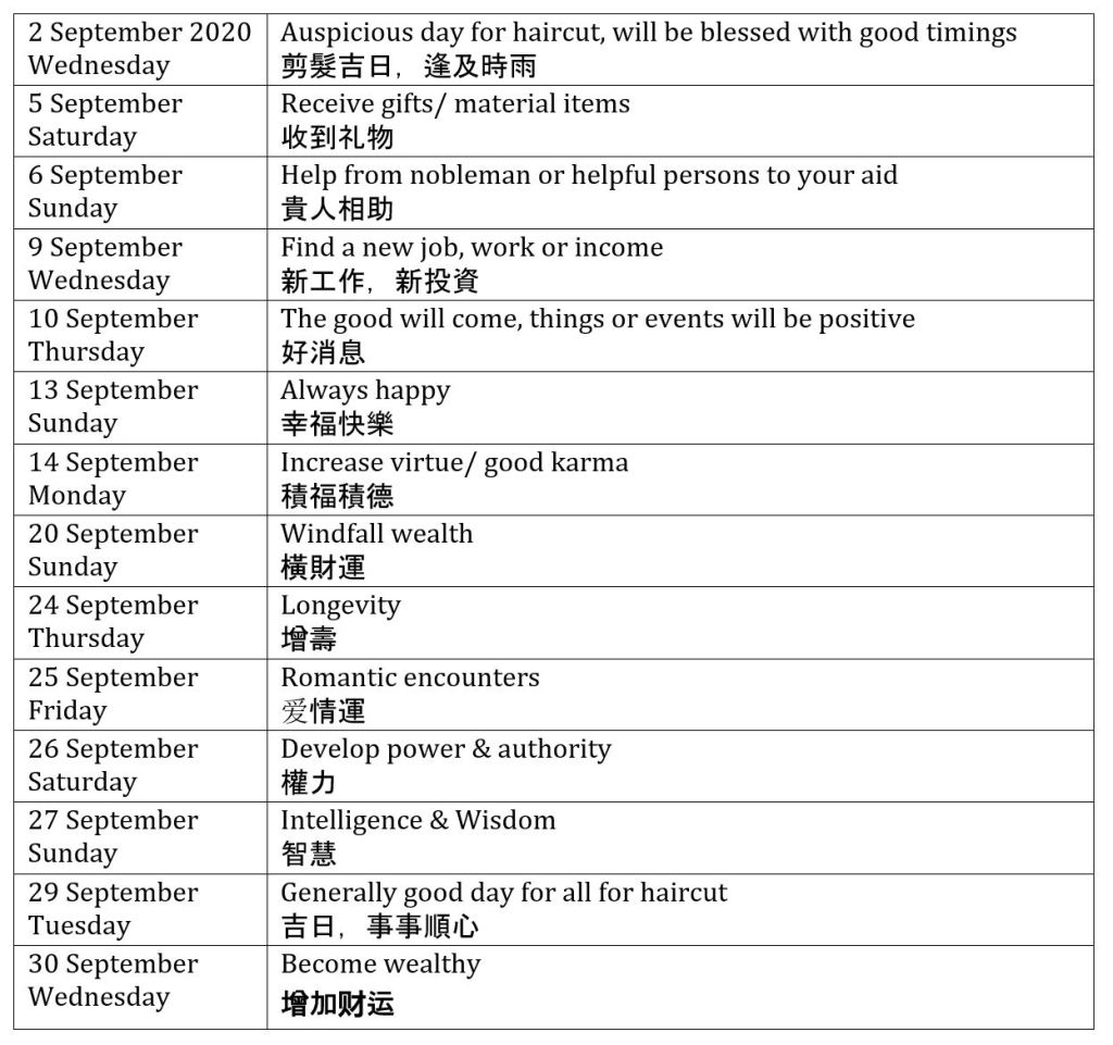 Sorry for the wait, here it is – the calculated auspicious days for haircut in September! Also for those who have been following, on 2 September (Wednesday) is another Heavenly Pardon Day in 2020! Incidentally, it is the 15th day of the Chinese Ghost Month where numerous prayers are made for the loved ones who had passed on. Perhaps it might be a useful day for you to do your prayers too.