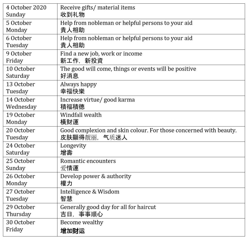 September 28, 2020October 18, 2020 goodluckeveryday Auspicious HairCut Days Oct 2020 Happy Mid Autumn Festival to all who are celebrating on the 1st Oct 2020! Moon cake Meanwhile, stay safe and wishing you good luck everyday ! Cheers! Share this: Click to share on X (Opens in new window) X Click to share on Facebook (Opens in new window) Facebook Like Loading... Related