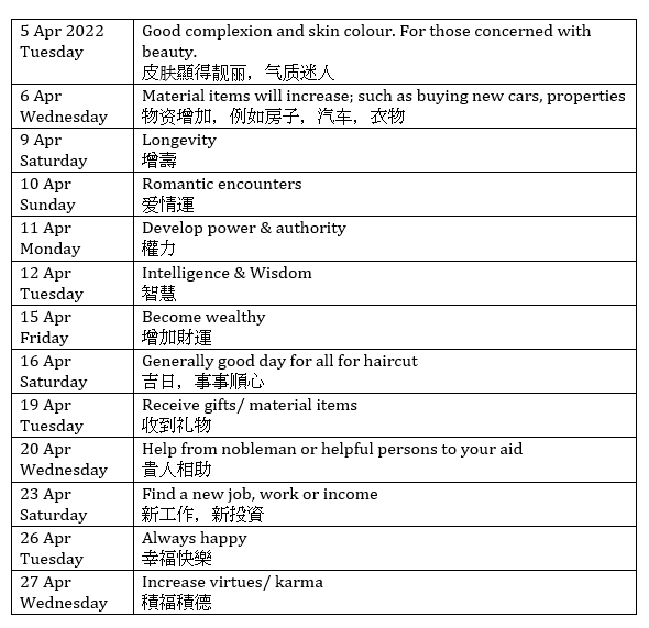 April 2, 2022 goodluckeveryday Auspicious Haircut Days April 2022 Missing a post!?! Here it is!! Not an April’s Fool joke haha. Thanks for your kind support to this site. Here are the auspicious days for you to improve your luck while in sync with your schedule! Wishing you good luck every day as always! Cheers Share this: Click to share on X (Opens in new window) X Click to share on Facebook (Opens in new window) Facebook Like Loading... Related