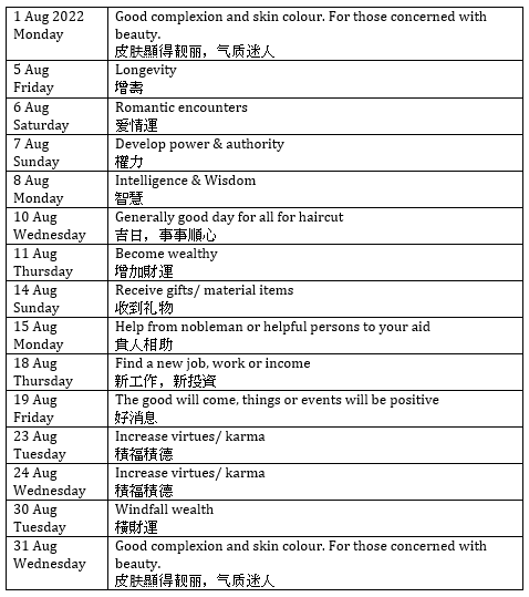 August 2, 2022 goodluckeveryday Auspicious Haircut Days – August 2022 Here it is…. the auspicious days for haircut in August 2022. Wishing you all good luck everyday as always! Share this: Click to share on X (Opens in new window) X Click to share on Facebook (Opens in new window) Facebook Like Loading... Related
