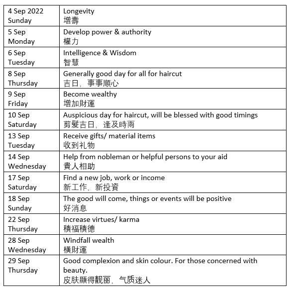 August 30, 2022 goodluckeveryday Auspicious Hair Cut days Sept 2022 Here are dates to book your haircut days in Sep 2022!! Wishing you good luck everyday as always! Share this: Click to share on X (Opens in new window) X Click to share on Facebook (Opens in new window) Facebook Like Loading... Related