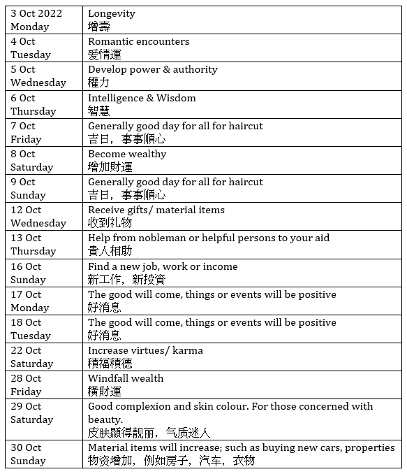 October 4, 2022 goodluckeveryday Auspicious Haircut Days Oct 2022 Here are the auspicious days for a haircut in Oct 2022! Hope your wishes comes true!! Wishing you good luck everyday as always! Share this: Click to share on X (Opens in new window) X Click to share on Facebook (Opens in new window) Facebook Like Loading... Related