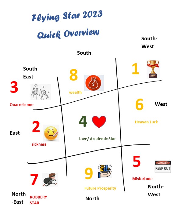 In 2023, the Fengshui Flying Stars of the year commence their new orientations on the 4 Feburary 2023 (haha, you still got some time). Here’s the chart on where the good luck sectors of your house are!!!