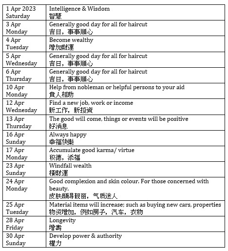 March 30, 2023March 30, 2023 goodluckeveryday Auspicious Hair Cut Days April 2023 Waiting for the auspicious haircut days in April 2023 ?? Here it is!! Wishing you good luck everyday as always! Share this: Click to share on X (Opens in new window) X Click to share on Facebook (Opens in new window) Facebook Like Loading... Related