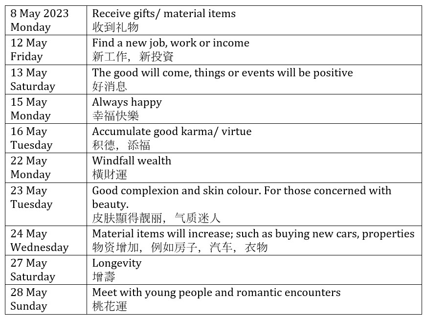 PS. for those engaging in Fengshui practice, do note the Yang Gong day in May is 25 May 23 Thursday!
