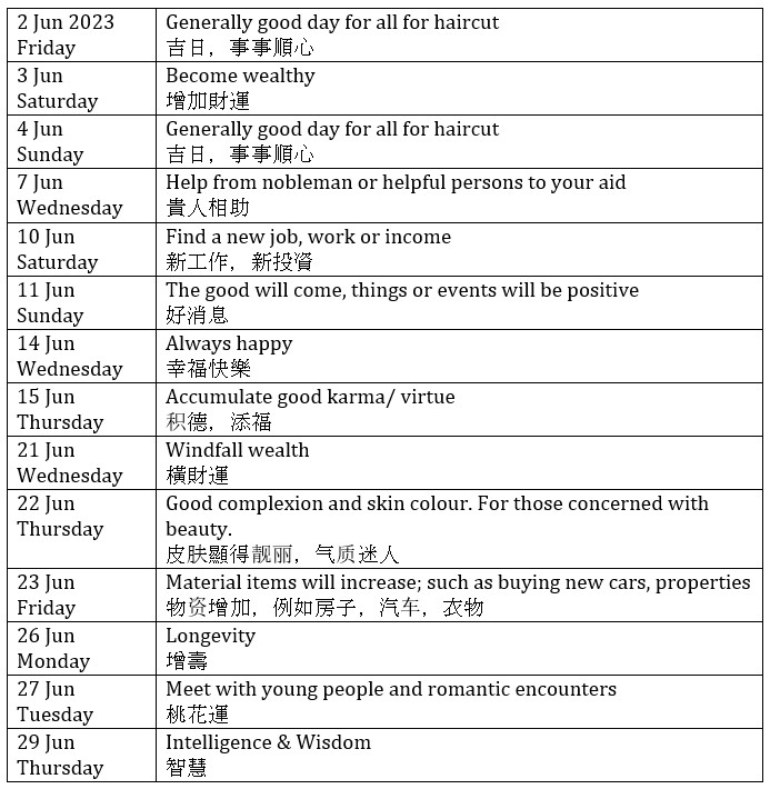 In this auspicious month of June, would also like to highlight the next Heavenly Pardon day on the 5 June Monday. It is one of the special 4 -5 days in the year where you can request forgiveness from Heaven. It is also a good day to ask for blessings.