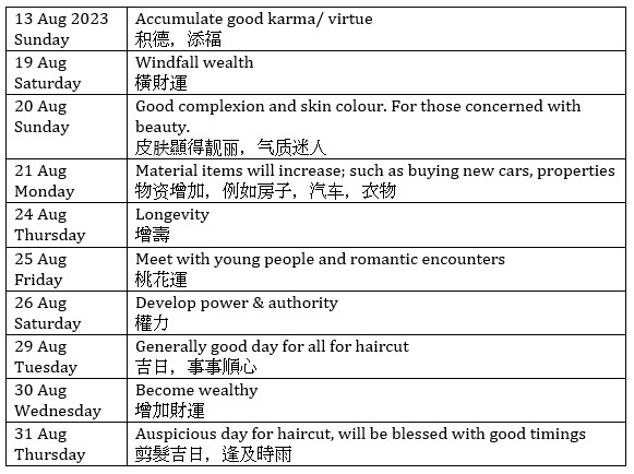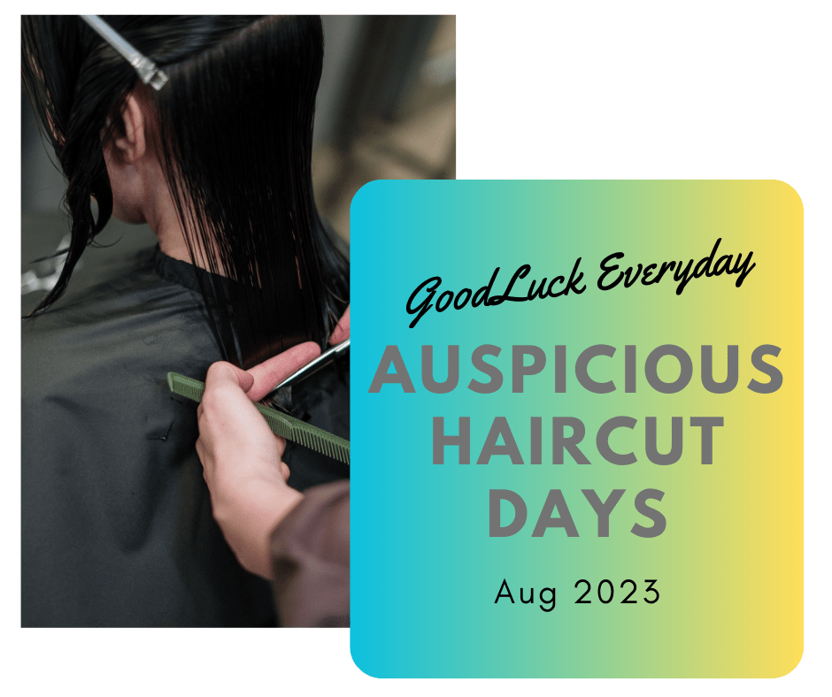 August 12, 2023 goodluckeveryday Auspicious Hair Cut Days Aug 2023 Hi all, here is it!! The long awaited auspicious days to cut your hair for August 2023! Wishing you good luck everyday as always!! Share this: Click to share on X (Opens in new window) X Click to share on Facebook (Opens in new window) Facebook Like Loading... Related