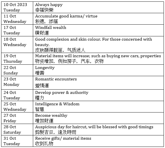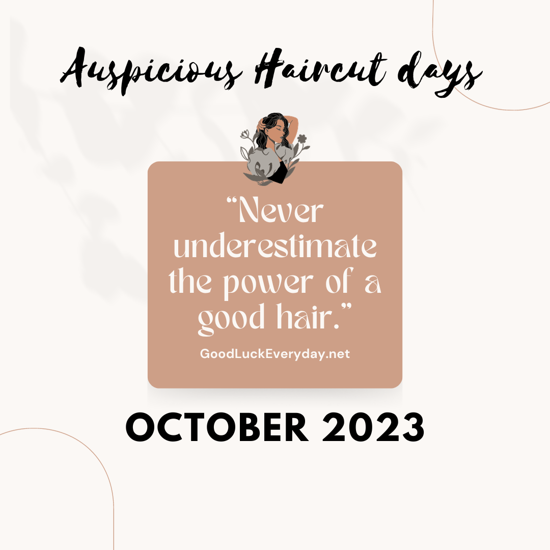 October 9, 2023 goodluckeveryday Auspicious Hair Cut Days in Oct 2023 Ready to snip away bad vibes and embrace fresh energy? Check out our October auspicious haircut dates chart! Find the perfect time to trim those locks and let the universe work its magic. πβοΈ Wishing you good luck everyday as always ! Share this: Click to share on X (Opens in new window) X Click to share on Facebook (Opens in new window) Facebook Like Loading... Related